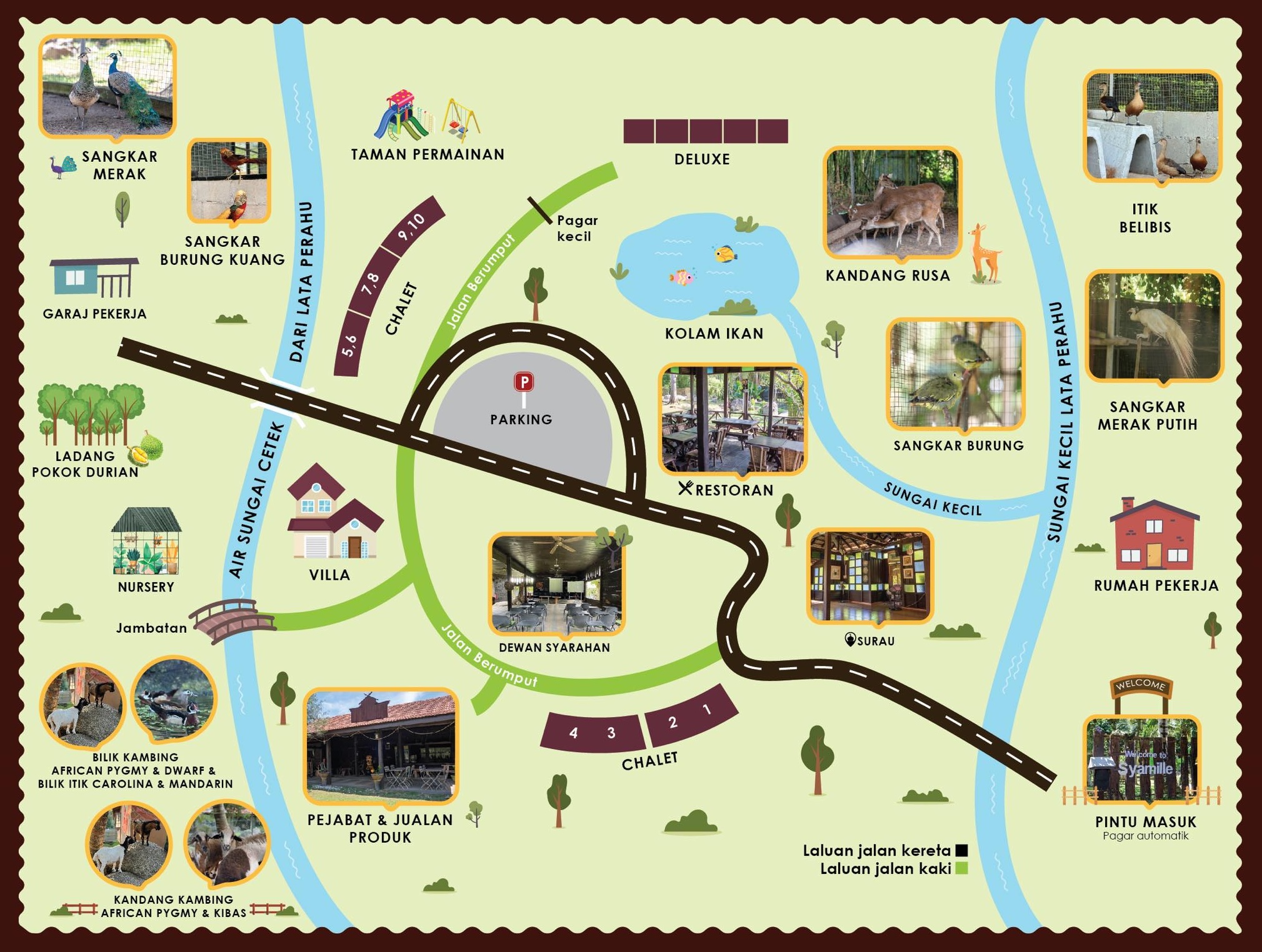 Lari dari hiruk-pikuk bandar dan temui kedamaian sebenar di Syamille Agro Farm & Resort – destinasi agropelancongan yang terletak di persekitaran semula jadi yang tenang di Kuala Kangsar, Perak. Menawarkan pengalaman menyeluruh merangkumi penginapan, pertanian, ternakan, rekreasi alam, dan sajian tempatan, semuanya disediakan dengan penuh integriti, etika dan nilai-nilai Islam.
